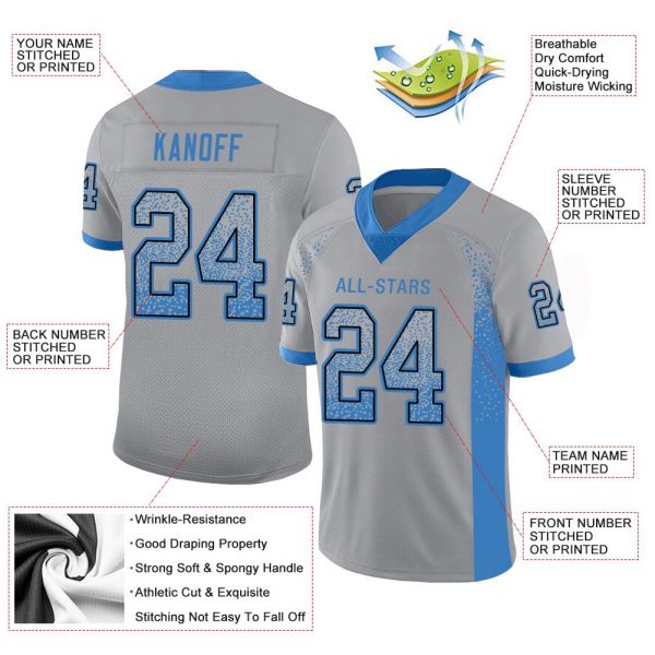 Be the first to review “Custom Light Gray Powder Blue-Black Mesh Drift Fashion Football Jersey” Cancel reply