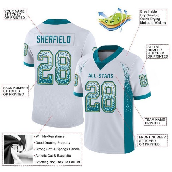Be the first to review “Custom White Teal-Old Gold Mesh Drift Fashion Football Jersey” Cancel reply