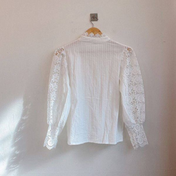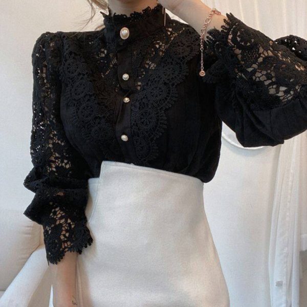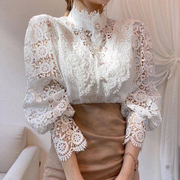 - Unique hollow out lace crochet design. long puff sleeve. button down closure. stand collared. Pleated. solid color. regular fit.